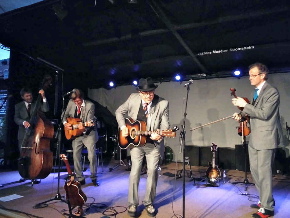 Konserten började dock med stillestånd. Totalt. Musikerna frös i sina positioner. Länge. Tills Östen på sin mandolin och fiolspelaren Gunnar Morén drog igång ”Banjoduellen”, som raskt övergick i en kavalkad av olika låtar som utmynnade i en sanslös version av ”Sofia dansar gogo”.