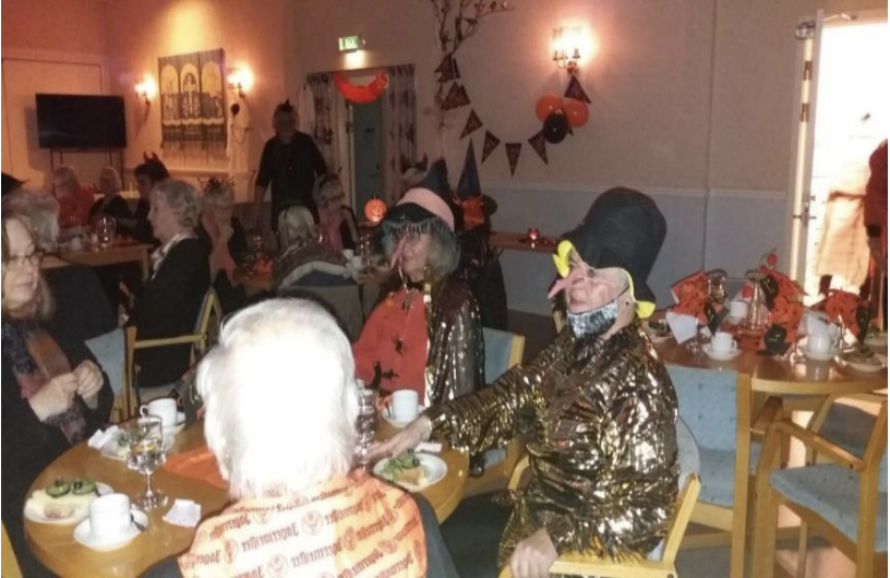 Centrumgården var pyntad med allehanda skrämmande saker, det började redan i entrén med spöken och annat skrämmande. Verkligen glädjande att det var så många som tänkt till på sin klädsel, det bidrog med glad stämning direkt, klart blev det diskussioner och undran vem som döljer sig bakom maskerna. Det bjöds på morotssoppa med god smörgås som hade både tunga och tänder verkligen duktiga värdinnor, kaffe och spökkaka.