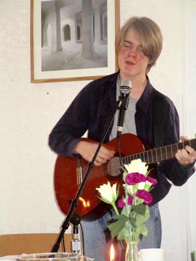 Föreningen har alltid ett inslag av underhållning och vid detta tillfälle engagerades en av Arbogas många lovande musikelever. Darian går i musikutbildning i Örebro men har framträtt vid flera tillfällen på stora scenen i Medborgarhuset. Han är sexton år, har en mycket god scenvana och presenterar sig själv utan att darra på rösten. Han framför ett antal engelska sångertill ackompanjemang av säkert gitarrspel och med en innnerlig känsla. Jag hoppas någon kan övrtyga honom att ta sig an vår svenska visskatt, som han skulle kunna ge nytt liv med sitt engagerande röst.