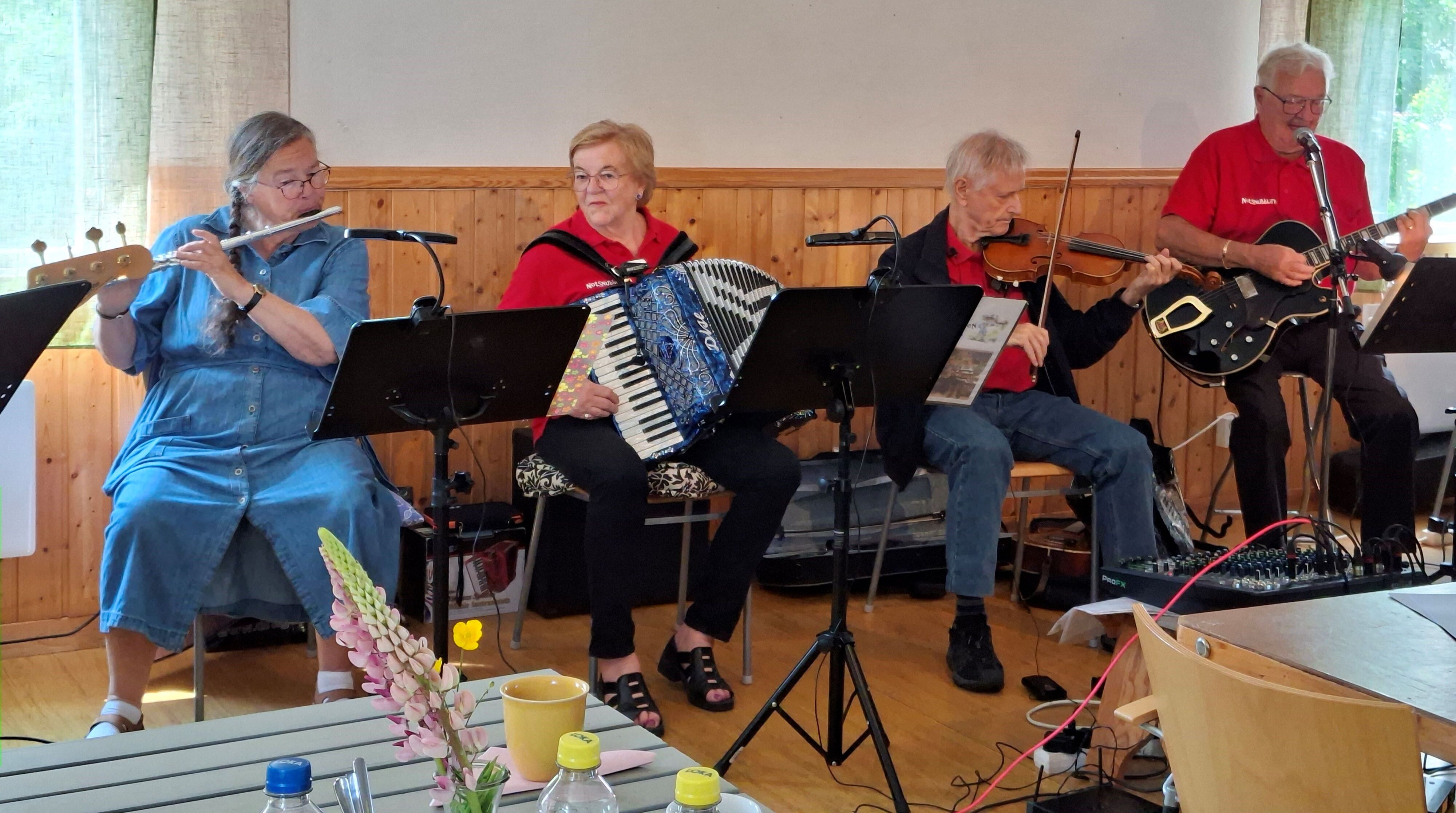 Ingen fest utan underhållning – denna gång hade Programkommittén bjudit in Notsnubblarna. Det är till ”vardags” ett spelglatt gäng från Köping bestående av sex personer, men som för dagen hade utökats till åtta. Så förutom fiol, dragspel och gitarr och sång hördes även vackert flöjtspel. En trevlig kavalkad av gamla låtar både på svenska och engelska. Många melodier hade anknytning från Dalarna, där några av bandmedlemmarna har vuxit upp. Allsångshäften på borden gjorde att det blev bra fart på sångerna, många ville sjunga med.