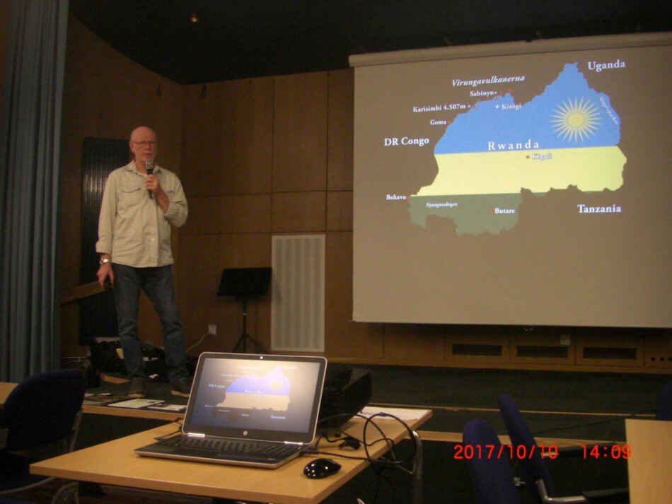 Tisdagen den 10 oktober befann sig ett fyrtiotal personer fysiskt i Medborgarhuset men mentalt i Rwanda. Naturfilmare Rolf Agnestrand lotsade med sina fantastiska filmer, en nästintill andlös publik bland bergsgorillor i Virungabergen i Rwanda.