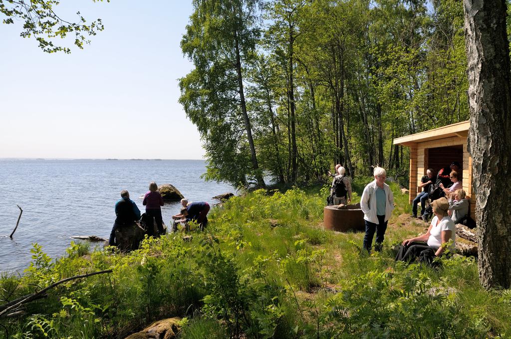 Den utmärkta vandringsleden fortsatte här men naturen var här kanske inte lika speciell som den vi hitintills passerat. Det som däremot var intressant var att vi efter en stund kom fram till en rastplats med både ett väl tilltaget vindskydd och en grillplats. Detta var efterlängtat och här kunde vi intaga vår som det heter medhavda matsäck. Rastplatsen låg på östra sidan av ön alldeles vid vattnet och med en bedårande utsikt över Lungers udde. Bättre ställa att rasta på kan man knappast tänka sig – gott fika och fin utsikt i sol och lagom temperatur.