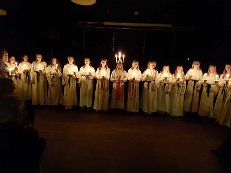 Stureskolans luciatåg, under ledning av Karin Cladin, tågade sedan in i salen. Lucia tillsammans med tjugo tärnor och tre stjärngossar framförde ett antal uppskattade jul- och luciasånger.