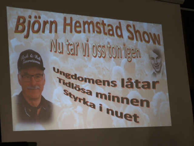 Margaretha Jurstrand hälsade alla välkomna och berättade, att vi denna gång skulle börja med underhållning av dagens artist Björn Hemstad från Rönninge utanför Stockholm. Han bjöd på nostalgi vid namn “Nu tar vi oss ton igen” med musik från 50-talet och tidigt 60-tal. Till ett mycket bra bildspel berättade han om musiken vi lyssnade till då, och till inspelat material sjöng han låtar som gjorts av bl.a. Elvis, Cliff Richard, Otis Redding och många fler. Vi blev också påminda om att vi som äldre ska ha aptit på morgondagen och livskvalitet i nuet. Dagens 70-åringar är de nya 20-åringarna, tidigare sas det att de var 50-åringar. Låter kanske konstigt, men trots hög ålder så är vi ganska pigga ändå. Björn vill kalla oss pensionärer för Mågottare. Programmet var synnerligen väl sammansatt.