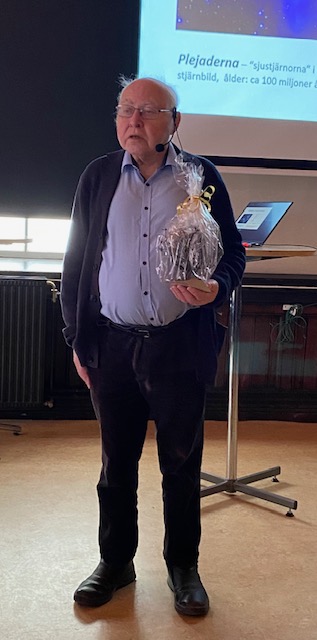 Efter ett mycket intressant föredrag om forskningens nuläge avtackades Rickman med luffarslöjd förfärdigad av Åke Frodin.