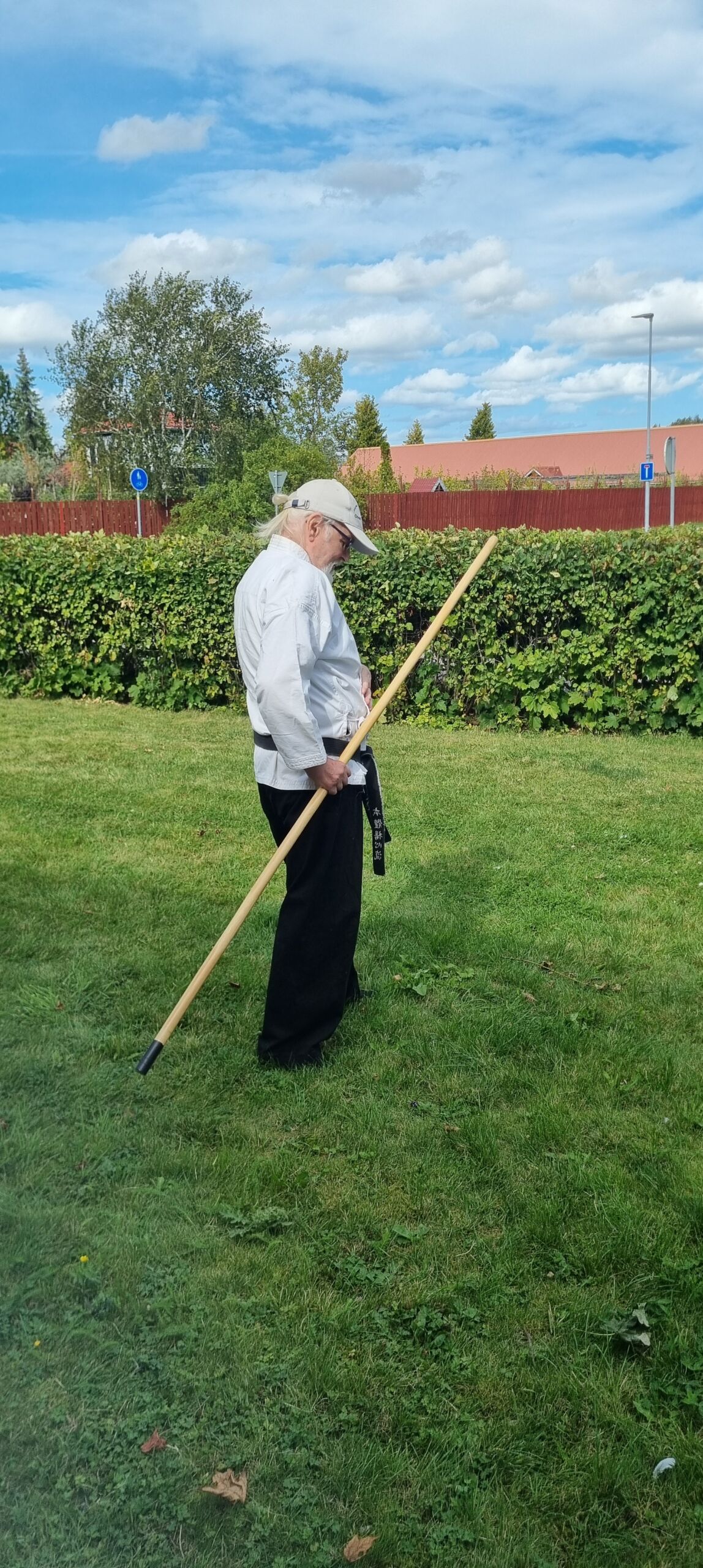 Vi avrundade med Christer, 3:e dan ifrån Hyr-Jutsu, som hade ett pass med Bo-Jutsu. Vi tränade utomhus, det var perfekt väder för det. Många hade inte tränat Bo-Jutsu förut. En kampform med trästavar. Det var en del folk som cyklade eller åkte förbi som stannade och tittade på vår träning.