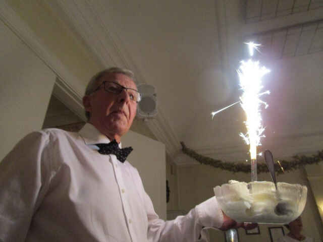 Vackert dukade bord med ljus i stora kandelabrar, gula rosor och manliga medlemmar som servitörer. En trerätters middag serverades och efterrättsglassen fördes in med blixtrande ljus.