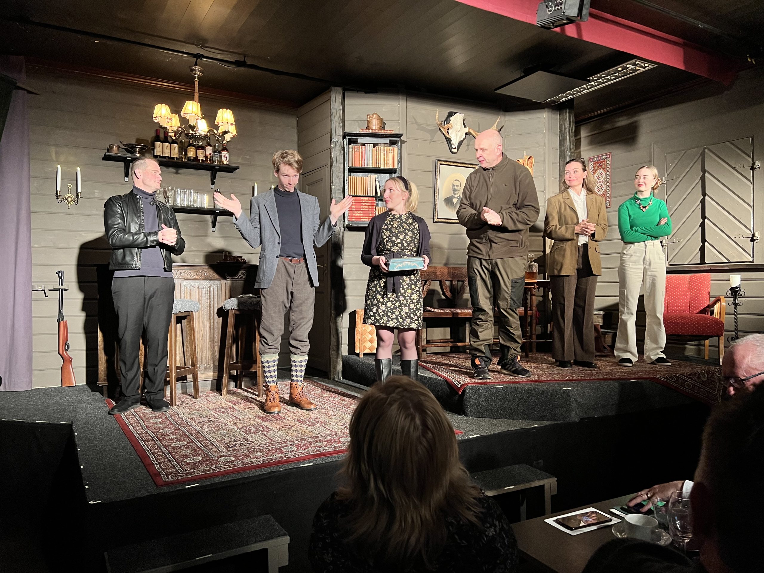 Pjäsen är 3,5 timmar lång och uppdelad i fyra akter. Under pauserna blev vi serverade en ”Deckarmeny” bestående av en utsökt trerätters middag med olika utbud av goda drycker. Varmrätten bestod av ”Grillad pluma på surdegsbröd med dragonemulsion, pickles och gremolata.” Googla gärna på ”pluma”! Maten serverades av skådespelarna som hade många roller under kvällen.
