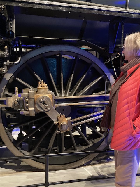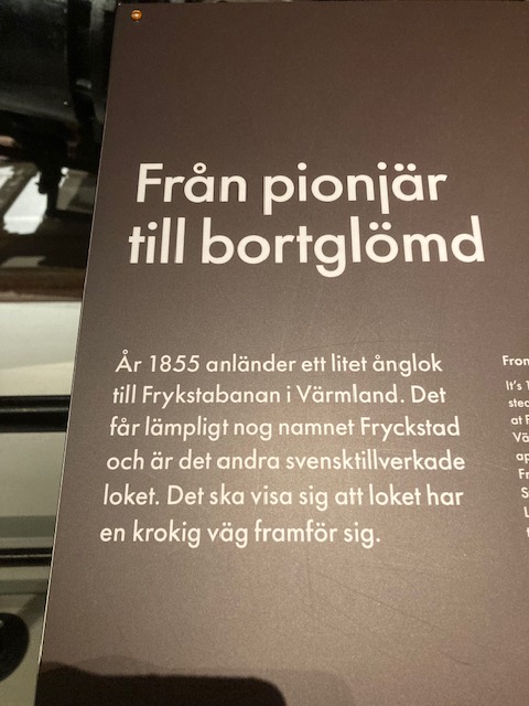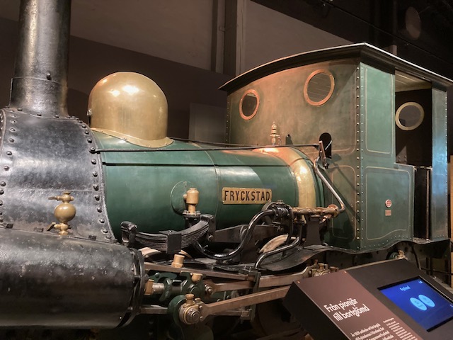 Vilken entusiastisk guide vi fick som med inlevelse och stor kunskap berättade om allt som rörde detta museum. Vi fick bland annat se lokomotivet Prins August som är det äldsta lokomotivet i världen som fortfarande går att köra. Vi får veta hur statliga och privata järnvägar byggs ut och att järnvägstiden blir till slut lika i hela landat. Spårvidden blir 1435 millimeter. Det enkla ångloket Frykstad är det andra som byggdes i Sverige, loket skulle byta ut hästarna. Nummer 1200, ett F-lok som är byggt för direkttåg mellan Stockholm och Berlin. Hjulen är imponerande stora. Detta visades upp på den stora konst och industriutställningen i Malmö 1914. Hjulen är imponerande stora.