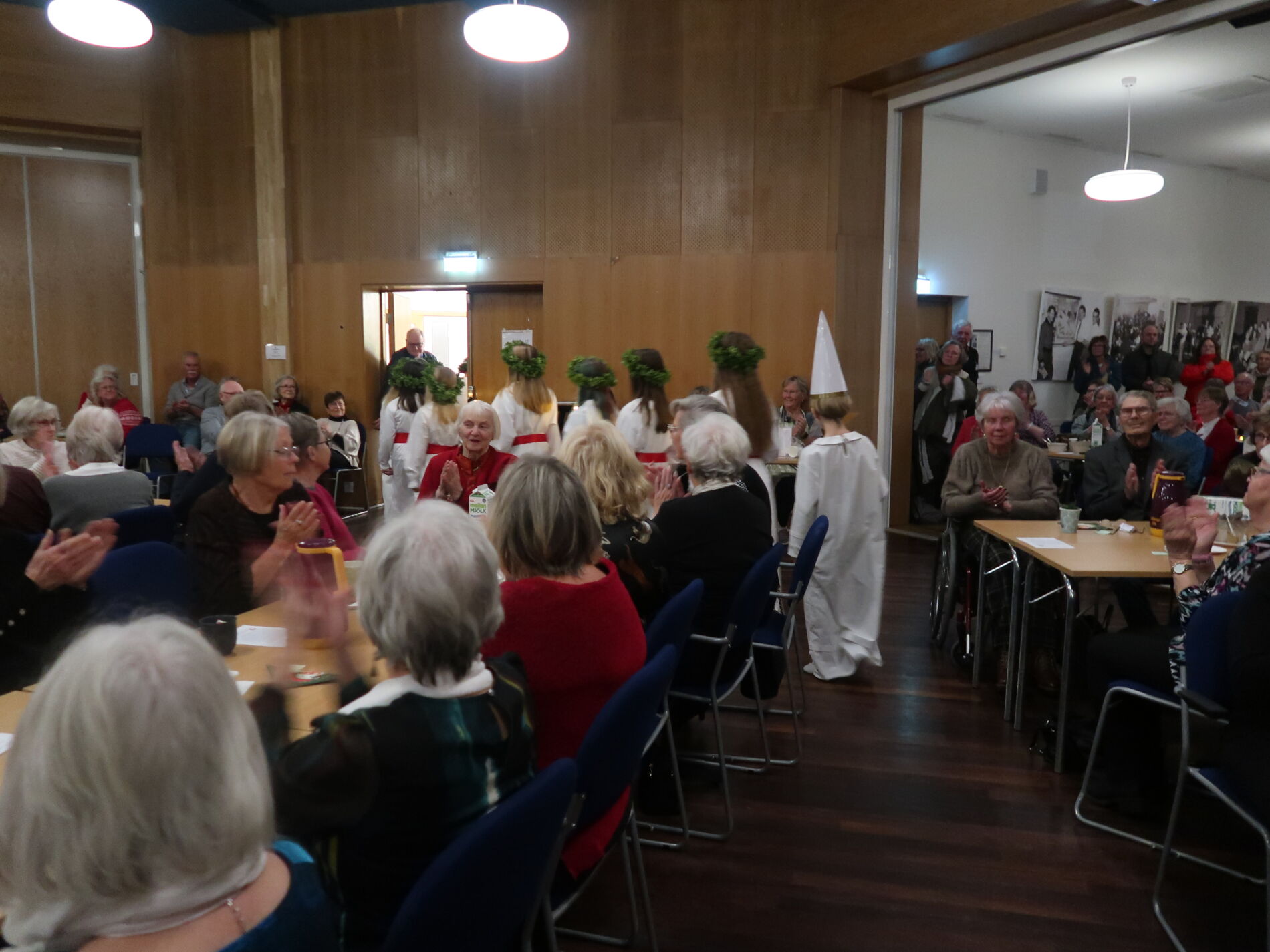 Därefter serverades det tomtegröt, skinksmörgås och kaffe innan vi fick besök av Lucia med tärnor och stjärngosse. Efter det framförde Pär Johansson traditionsenligt ”Tomten” av Viktor Rydberg.