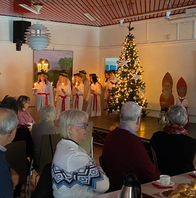 Trots den bistra kylan hade nästan 80 medlemmar hittat till Mötesplats Tunadals. Efter luciatåget serverades det kaffe med lussebulle och pepparkaka. Stämningen var på topp. Mötet avslutades med lotteridragning, där vinnarna fick möjlighet att fritt välja ett paket från vinst-bordet.