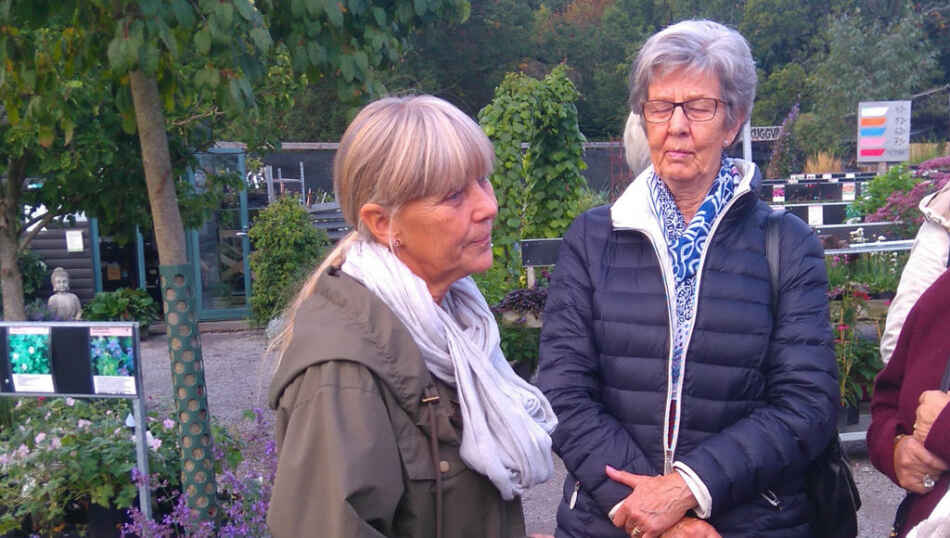 Den ena gruppen får först en fin redogörelse för allt det arbete som sker med de olika modellträdgårdar som de bygger upp för besökare och alla de som behöver hjälp vid anläggning av nya trädgårdar. De kan se en trend att allt som kommer till trädgården skall vara färdigvuxet och klart, lättskött med mycket stenläggningar och gärna i terrasser. Det fanns även många stora rabatter där kunder kan plocka de örter, blommor de önskar och sen passera kassan.
