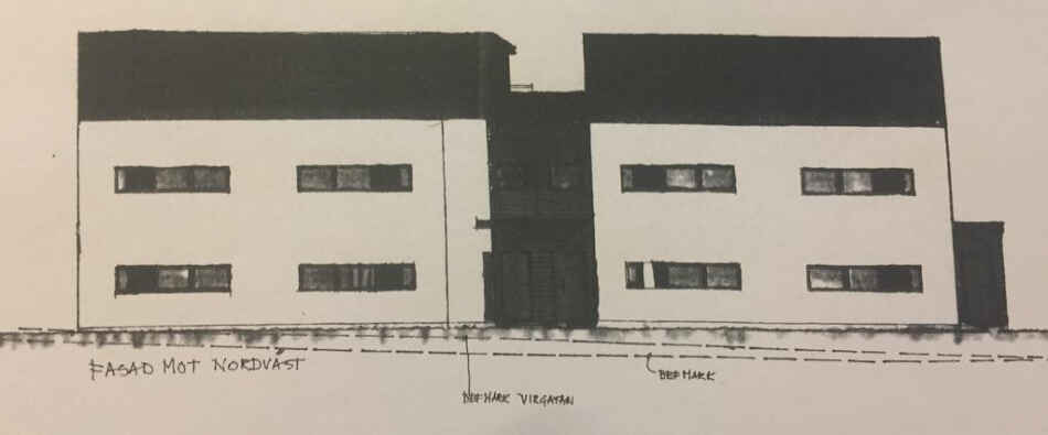 Den byggnadskulturellt värdefulla villan i hörnet S:t Olovsgatan/Virgatan i Köping ska ersättas av ett tvåfamiljshus av modernistiskt snitt. En skiss på hur trädgårdssidan ska se ut har publicerats i andra medier. Här intill syns hur ”arkitekten” tänkt sig fasaden ut mot gatan, det vill säga hur de flesta kommer att se huset.