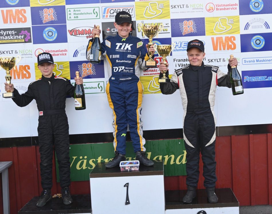 ”Återigen är det först i mål som vinner, denna gång av Köpings Alfred Eriksson och Likenäs Hampus Hagström. Två poängs övertag har Alfred och hittills har de två segrar vardera. Alltså, den som vinner i helgen vinner cupen”, skriver Crosskart-utskottet i Svenska Bilsportförbundet i ett pressmeddelande.