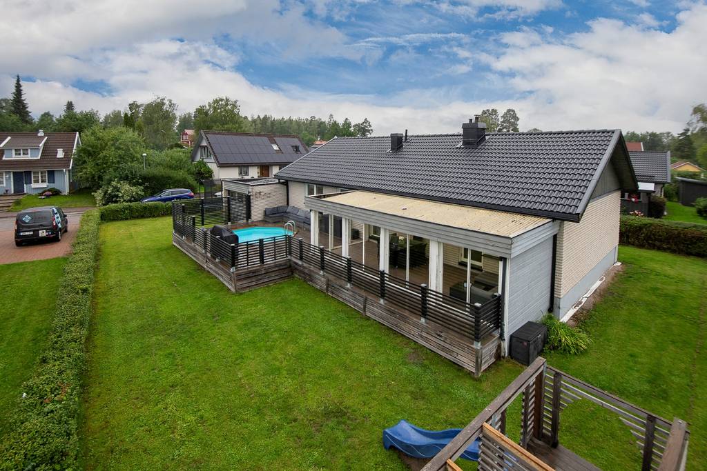 Huset står på en lättskött trädgårdstomt med många soltimmar. På tomten finns ett inglasat uterum med skjutbara dörrar samt med vidare access till soldäck med pool.