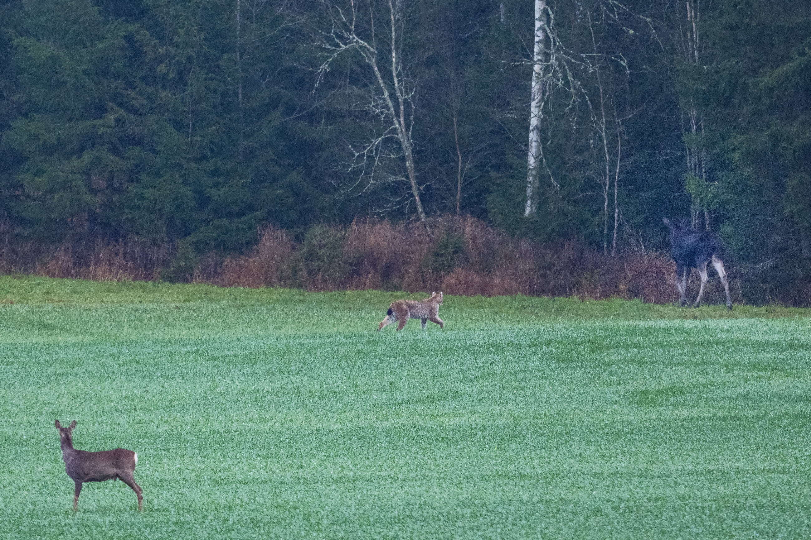 Som när lodjuret plötsligt klev fram mellan älg och rådjur på åkern utanför huset.