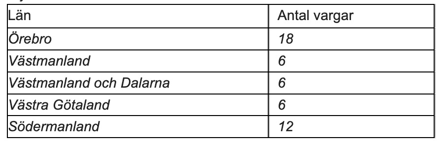Totalt får 48 vargar fällas i landet, varav 36 i mellersta och 12 i södra rovdjursförvaltningsområdet*. Länsstyrelserna har efter samråd enats om jaktuttag i följande län: