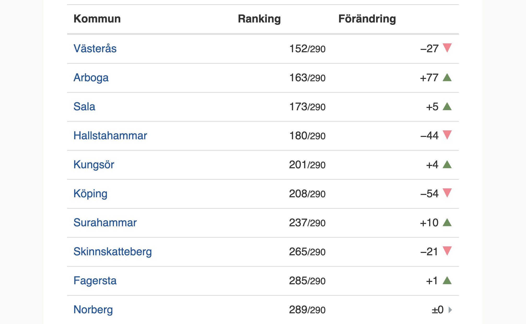 Jämfört med förra året har fyra av tio kommuner i Västmanland klättrat i rankingen Den genomsnittliga rankingen för länets kommuner är 215 av 290, men det finns betydande skillnader mellan kommunerna i länet.