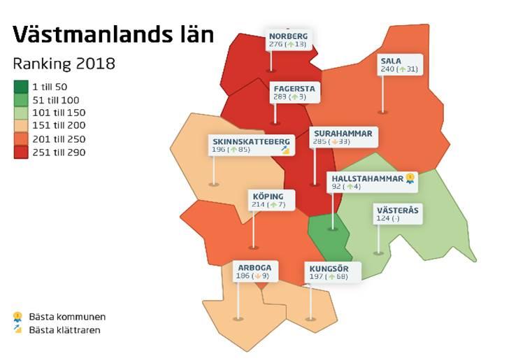Flera kommuner i Västmanland klättrade på rankingen. Bland annat Kungsör, som tog sig uppåt 68 placeringar, och nu huserar på plats 197.