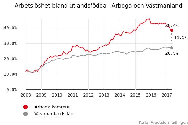 I Västmanland i stort gick trenden åt motsatt håll. I hela länet ökade arbetslösheten bland utlandsfödda med 1,1 procentenheter – och ligger nu totalt på 26,9 procent.