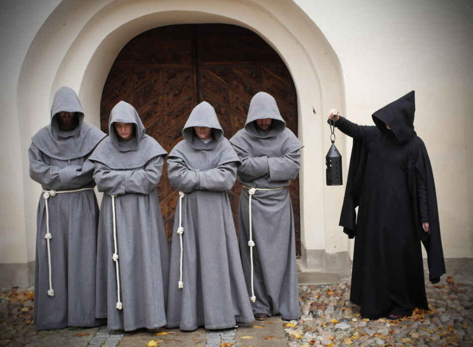 Franciskanermunkarna (Bo Sporre, Emelie Hertzman, Amanda Kilpeläinen Arvidsson och Leo Matthis Dickson) och Vägvisaren (Lisen Hertzman) visar en mörkare sida av staden i ”Skymning över Arboga”. Foto: Lars Lykta/Arbogateatern