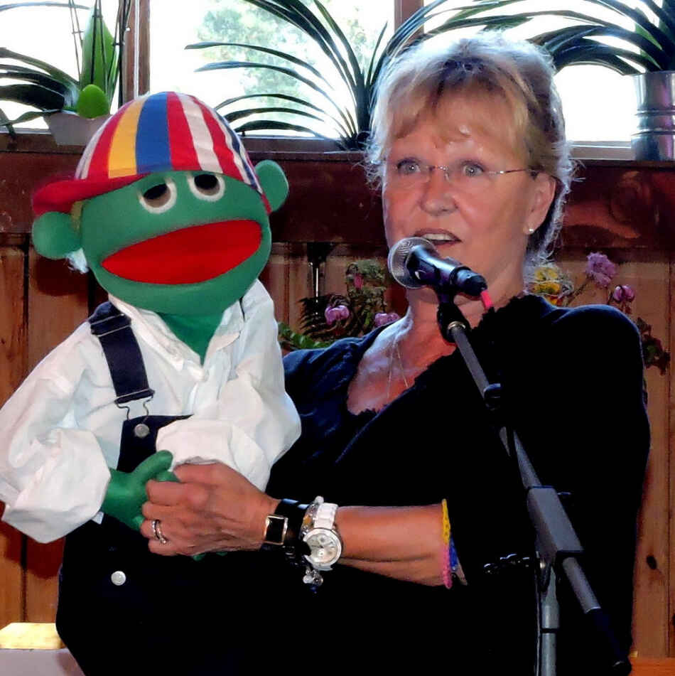 Med Lennart Sjöholm vid flygeln sjunger Hasse Hallström och Ingamay Hörnberg – som brukar ha med sig dockan ”Lille Skurt”, känd från över 3000 TV-program.