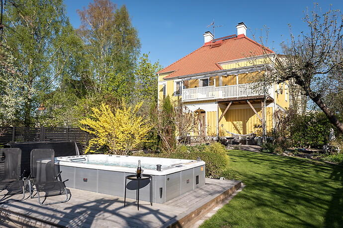 Femrumsvillan beskrivs som en spatiös villa i centralt läge med en egen insynsskyddad oas där inget har lämnats åt slumpen.
