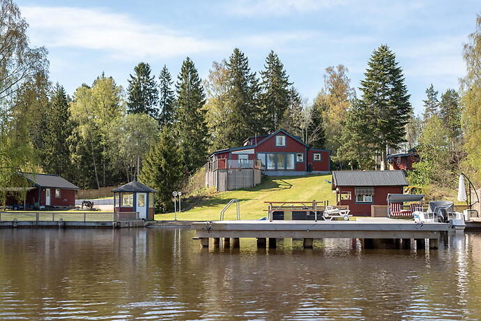 Femrumsvillan om 124 kvadratmeter stoltserar med 3 415 kvadratmeter sjötomt med egen brygga och sandstrand.
