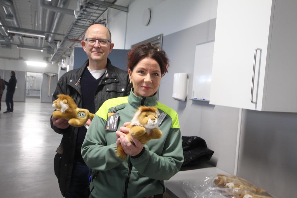 Lions ”kuppade” och delade ut fyra lejon till personalen. Gåvorna var en symbolisk present. Fler lejon ska skänkas för barnen som behöver åka med i ambulansen.