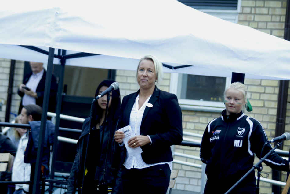 Skolans rektor Anna-Maria Persson höll tal under invigningen av spelen. FOTO: DENNIS JOHANSSON STRÖMBERG