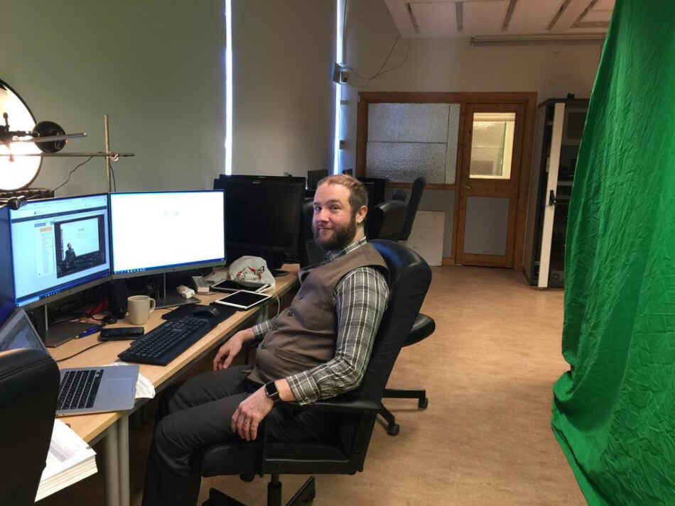 Sjölin, som är lärare i matematik och programmering, har byggt upp en inspelningsstudio i ett klassrum med flera bildskärmar, dator, lärplattor och en greenscreen.