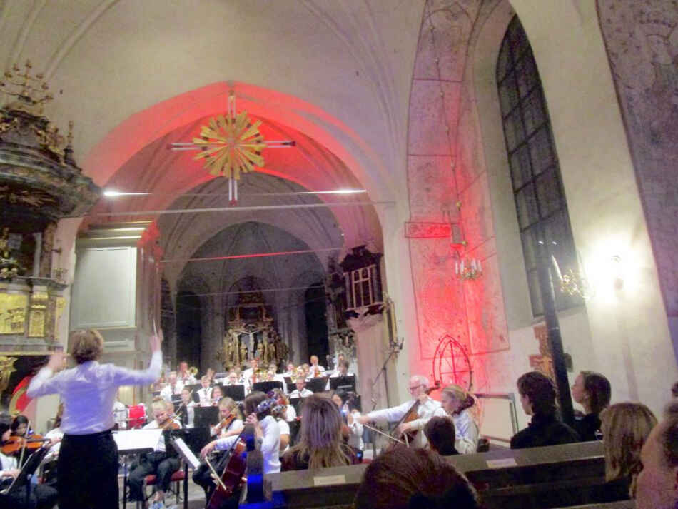 Det var en stor samling deltagare från musikskolans alla olika former. Ungdomsmusikkåren, ungdomsstråk, flöjtensemble, brassensemble ,sångelever och Showgruppen bildade med ett åttiotal deltagare en imponerande stor grupp i koret.