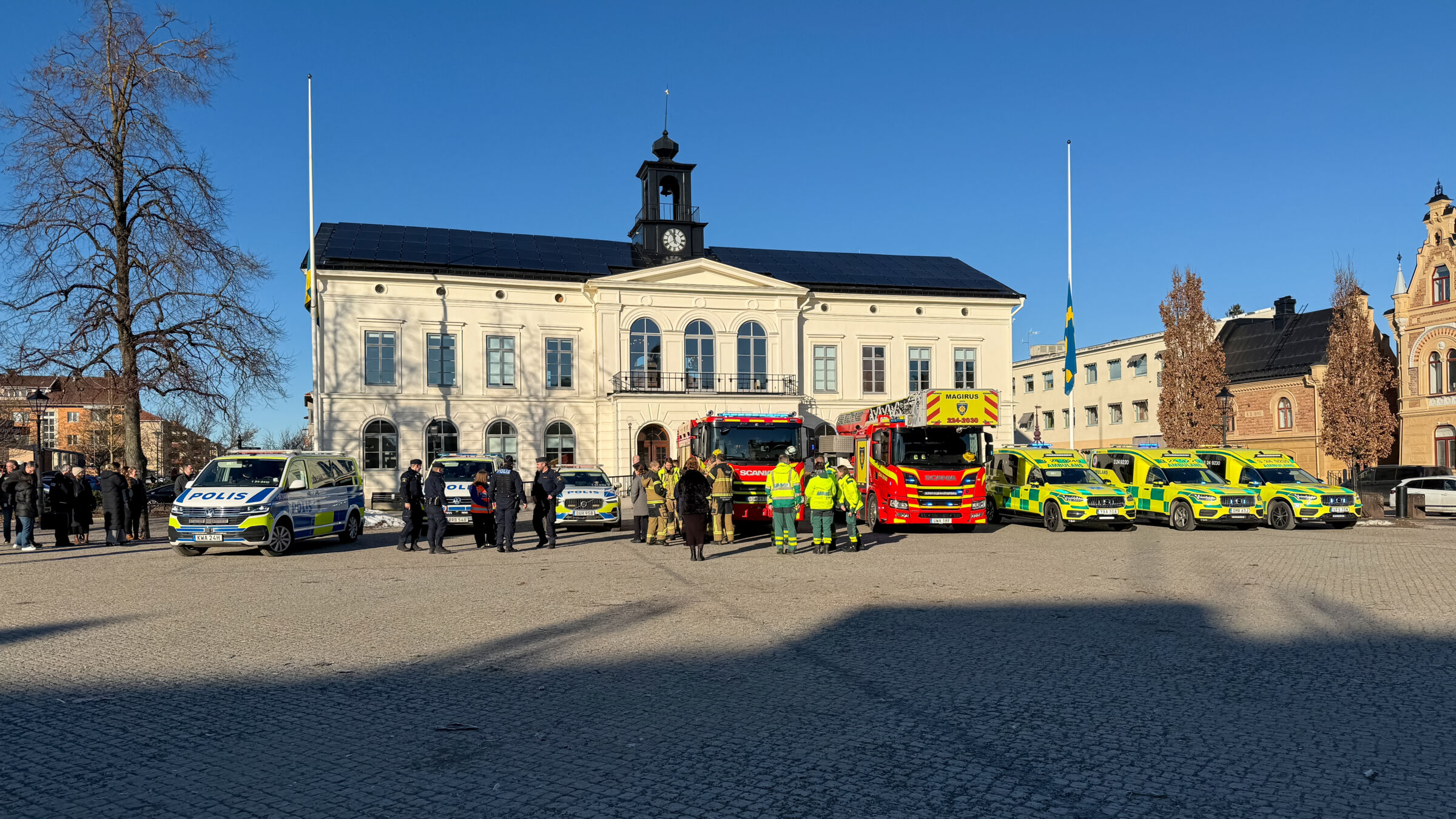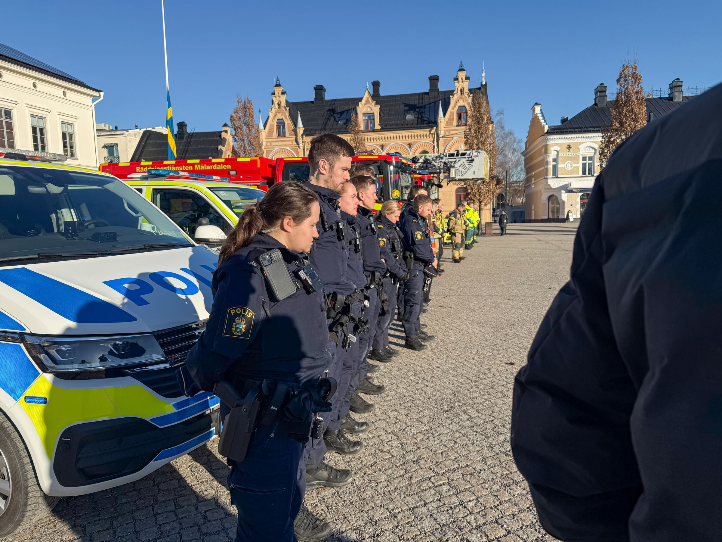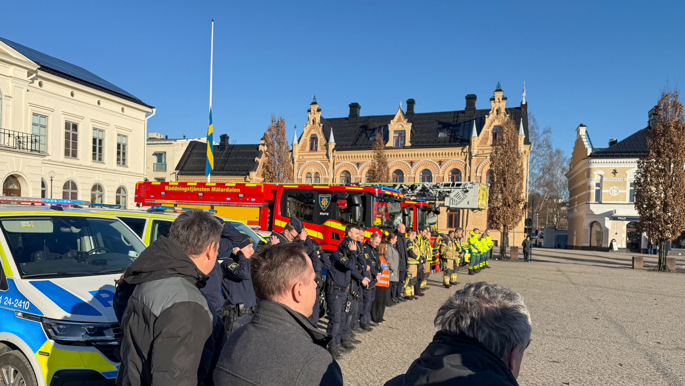 På Stora torget i Köping samlades blåljuspersonal från ambulansen, polisen och räddningstjänsten tillsammans med personer från Köpings kommun och flertalet privatpersoner.