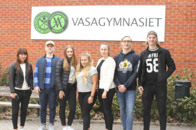 Läraren Helena Engström, Emil Jauring, Jenny Hamrén, Malin Jirovsky, Adisa Avdic, Anton Carlsson och Felix Hedquist. Julia Pelander Djupsjö saknas. FOTO: DENNIS JOHANSSON STRÖMBERG