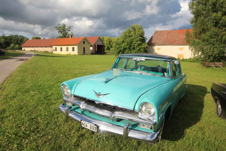 Tidigt på kvällen har det kommit ca. tio bilar. Alla är olika och intressanta på sitt sätt, det står en ljusblå Plymouth Belvedere och glänser i solstrålarna, starka strålar som har tryckt sig fram mellan molnen.
