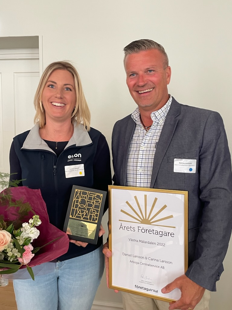 med välmående i sitt företag. De har trots stor konkurrens och ökad oro från omvärlden bevarat sitt företags stabilitet genom åren. De är omtyckta personer med duktig personal som alltid ger bästa service och bemötande och deras fina butik är lite av ett landmärke i Arboga. Daniel & Carina visar att det går alldeles utmärkt att driva företag och få ihop livspusslet bara viljan finns. Det är med glädje vi utser Daniel & Carina på Arboga Centralservice AB till Årets Företagare i Västra Mälardalen 2022”.