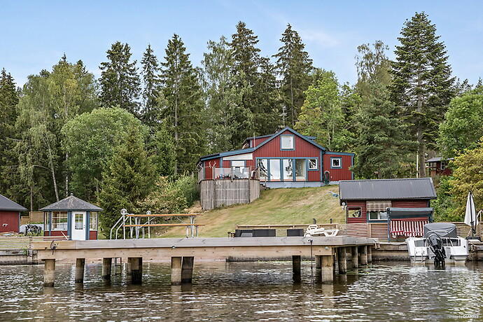 Femrumsvilla om 120 kvadratmeter med egen badstrand och brygga med bådplats vid Mälaren. Utöver läget lockar annonsen med ett dubbelgarage, gästhus, förråd och lusthus.