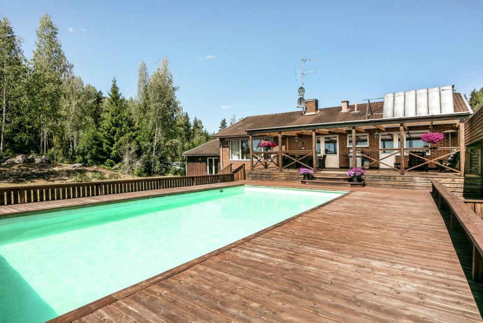 Beskrivs som en stilfull villa i ett lugnt och naturnära läge. Villans totalt 306 kvadratmeter rymmer en familjevänlig planlösning med många sovrum och sällskapsytor. Från vardagsrummet nås stor altan intill pool med trädäck.
