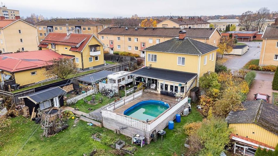 Ett hus för den stora familjen med 4 sovrum, allrum och vardagsrum med utgång till stort altandäck med pool och inglasat uterum. Ett badrum samt ett till utrymme som med enkla medel kan göras till ännu ett badrum. Källarplan med tvättstuga, hobbyrum och förvaringsutrymme.