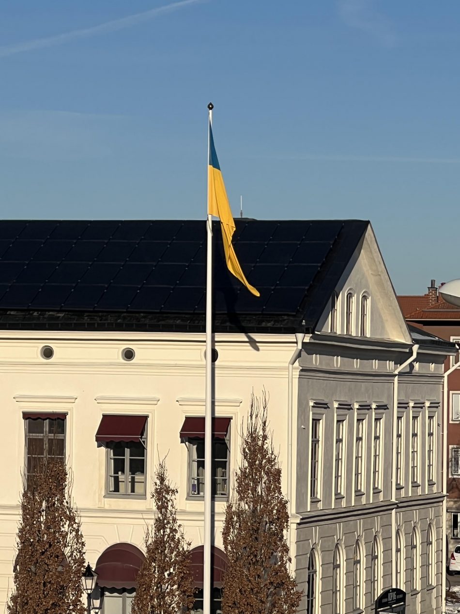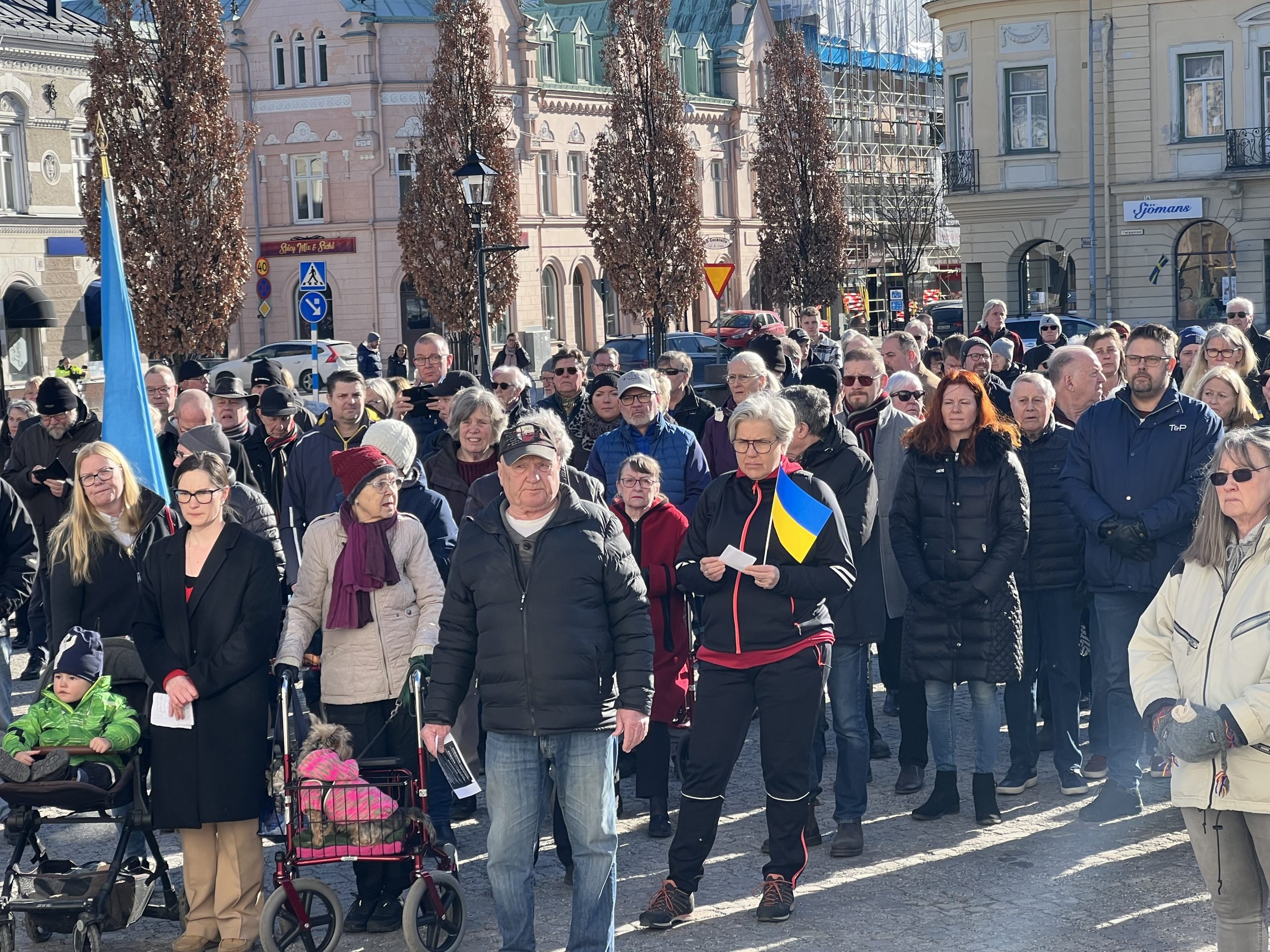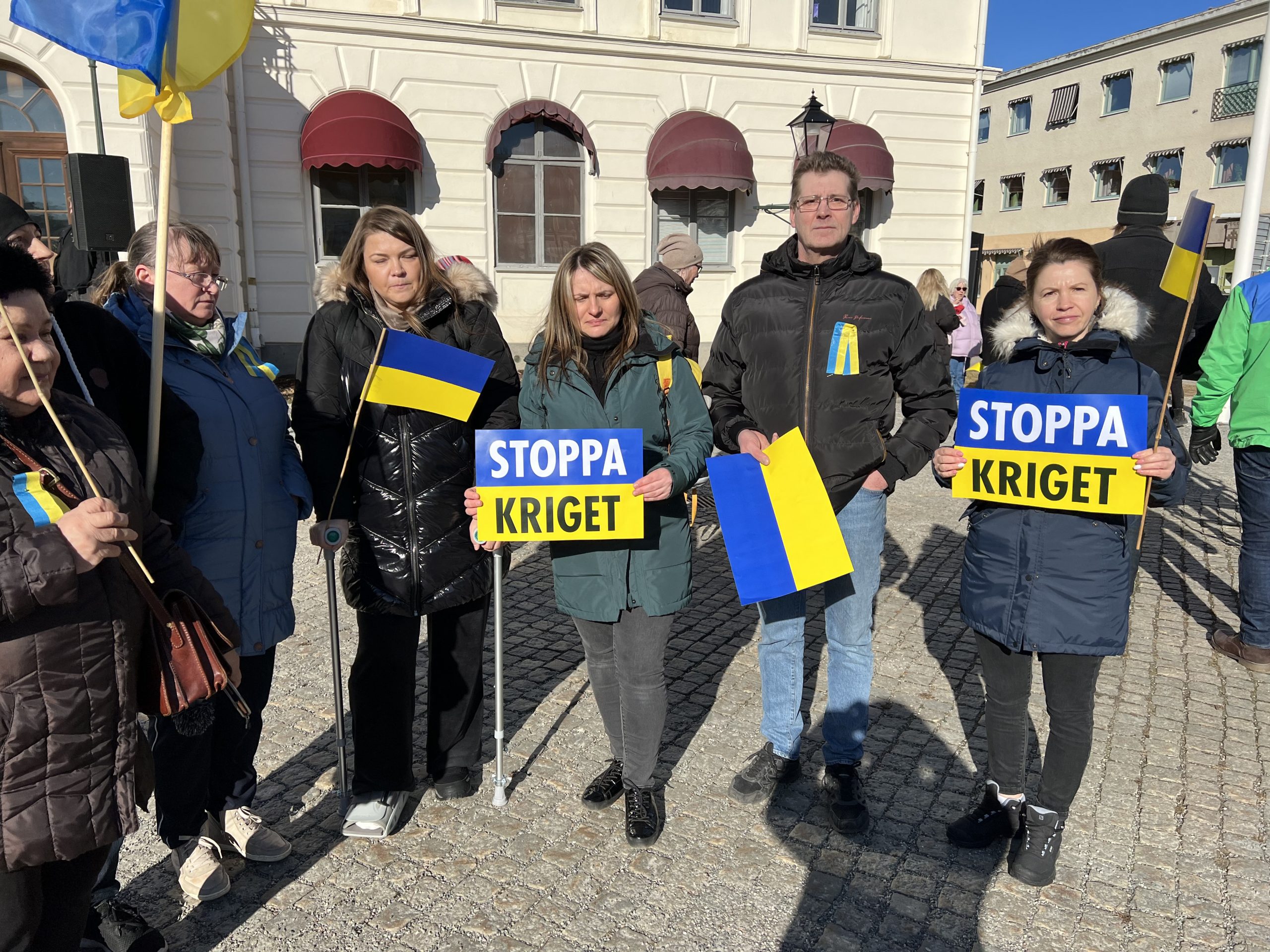 Den blågula ukrainska flaggan vajade i vårsolen framför Rådhuset på den högra flaggstången. På den vänstra var Köpings flagga hissad. De som samlats kom från alla stadsdelar och alla partier.