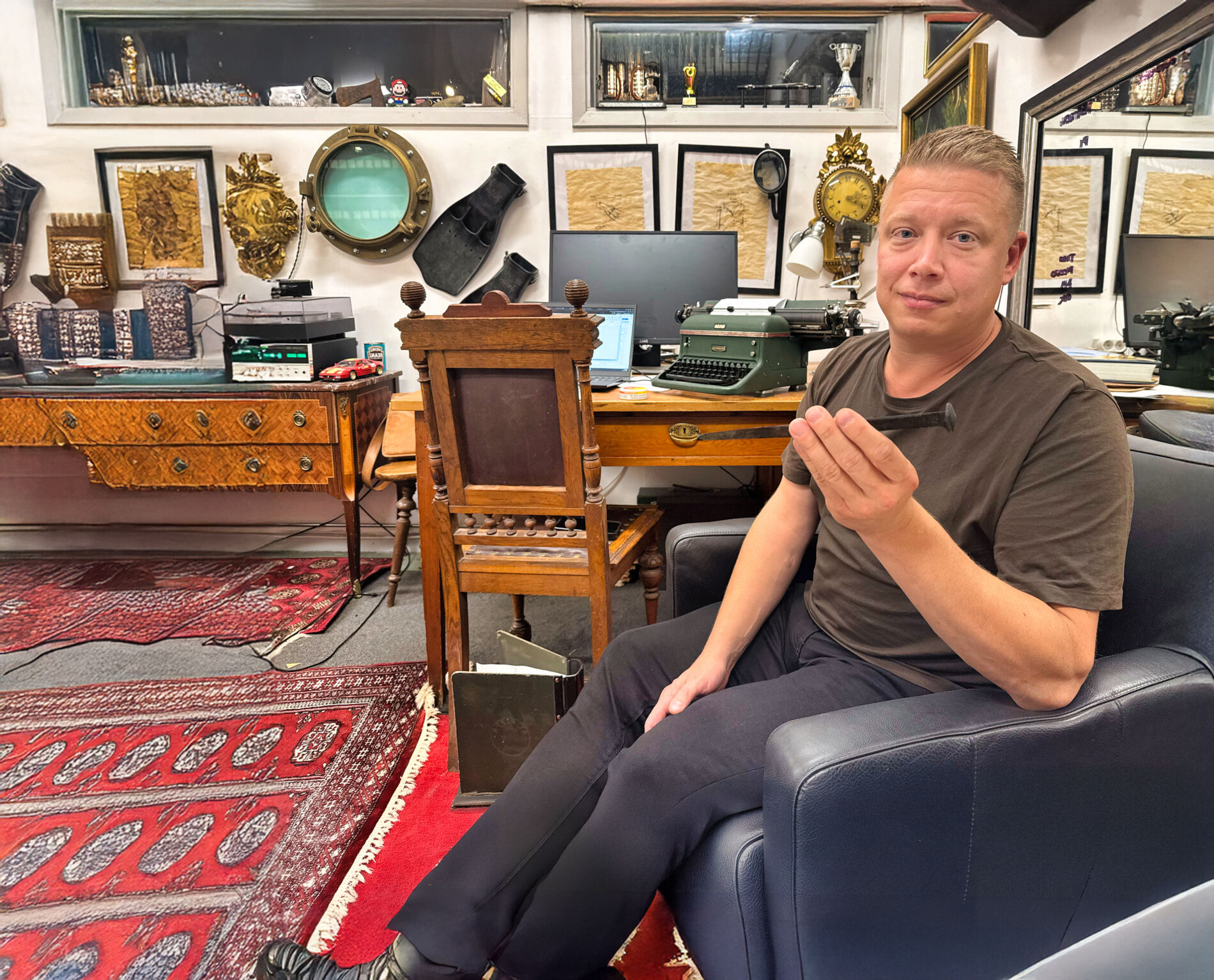 En vit gammal Mercedes är parkerad. Rummet är fyllt med prylar med affektionsvärden för Thomas. En grön, klassisk skrivmaskin av märket Hallda står på ett skrivbord. Några stora originalspikar, som Thomas fick av en kompis när Apotekshuset, ritat av Teodor Dahl, renoverades. Han visar mig en sovjetisk filmkamera, en Super 8, som han en gång bytte till sig mot en burk av Mor Annas Pepparkakor. Mot en vägg hänger ett antal hattar, som Thomas samlat på sig under sina äventyrsresor.