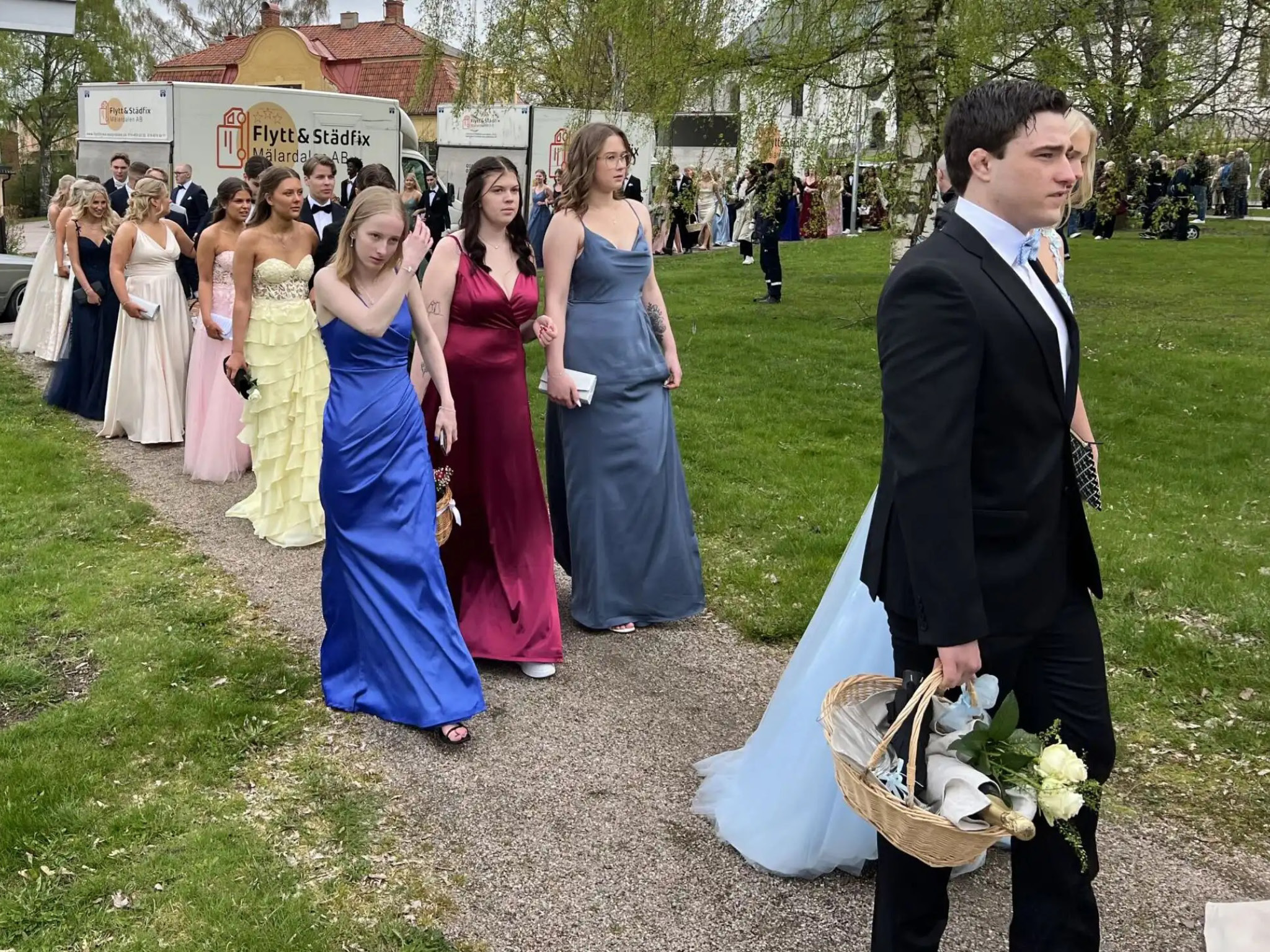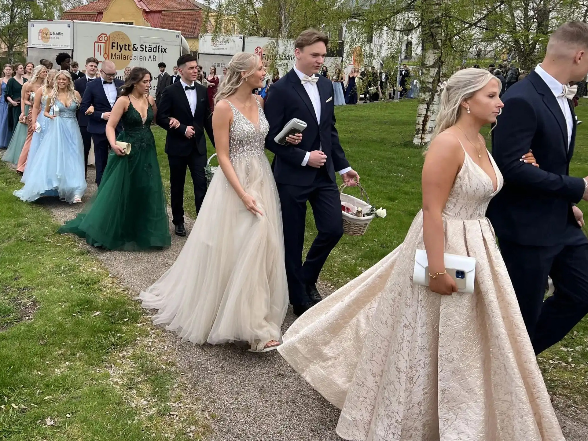Dags för avgångselevernas sedvanliga bal. Stor uppvisning i kostymer och balklänningar, trots kylan.