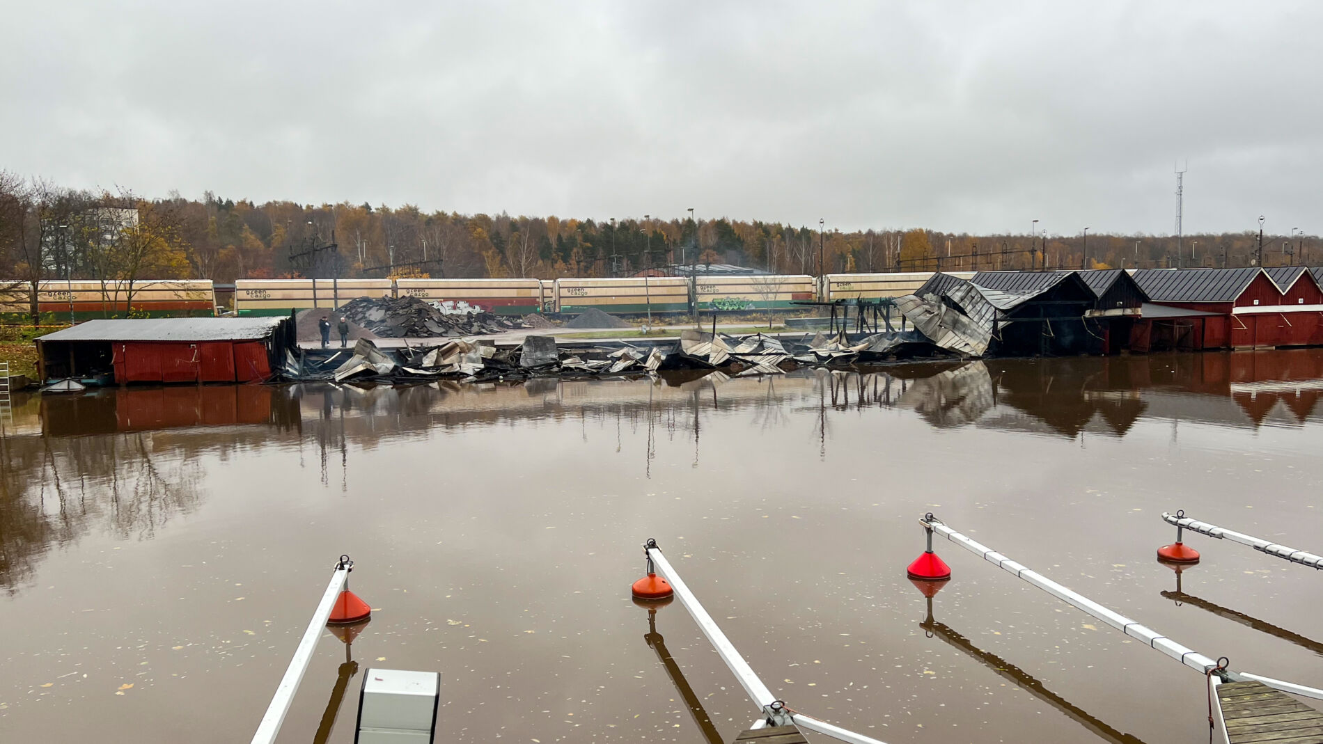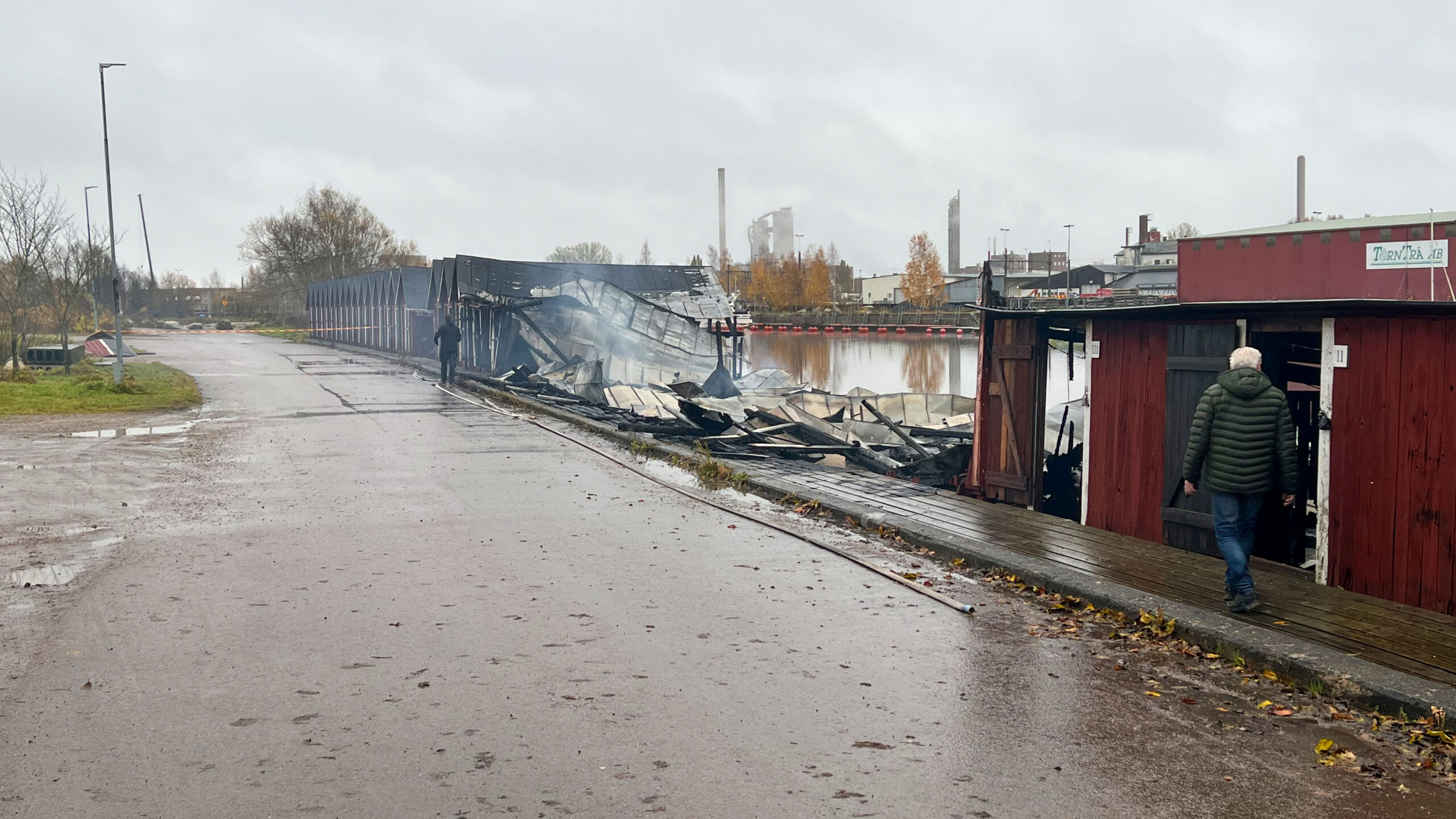 Flera av de små båtskjulen, minst ett tiotal, föll ihop och totalförstördes i branden. Vid 03-tiden hade räddningstjänsten fått kontroll på branden och stoppat risken att den skulle spridas vidare.