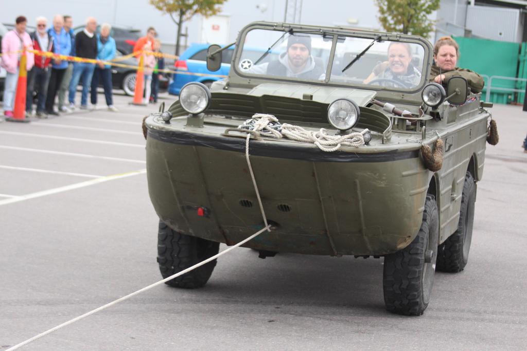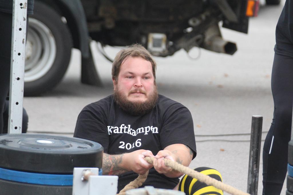 Kraftkampen började stenhårt, med att deltagarna skulle dra en bil med passagerare i. Inte nog med det hängdes ett traktordäck bakpå bilen för att öka tyngden och försvåra tävlingen.