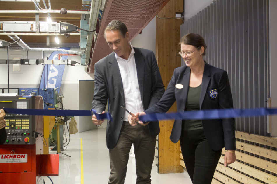 Tomas Bäckman, platschef vid Volvo Powertrain i Köping, och Ullvigymnasiets rektor Anna Ulfves klippte tillsammans bandet som officiellt invigde de uppfräschade lokalerna vid Industritekniska programmet. Foto: David Eriksson