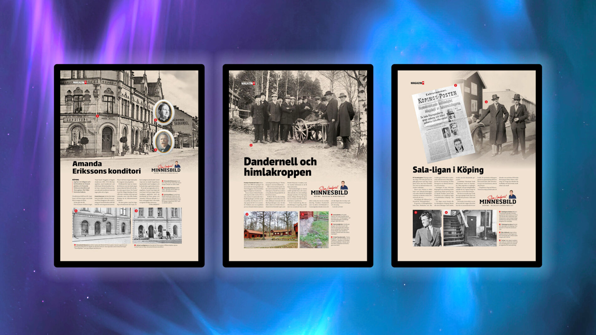 Minnesbildens artiklar som inramade tavlor i formatet 50x70 cm.