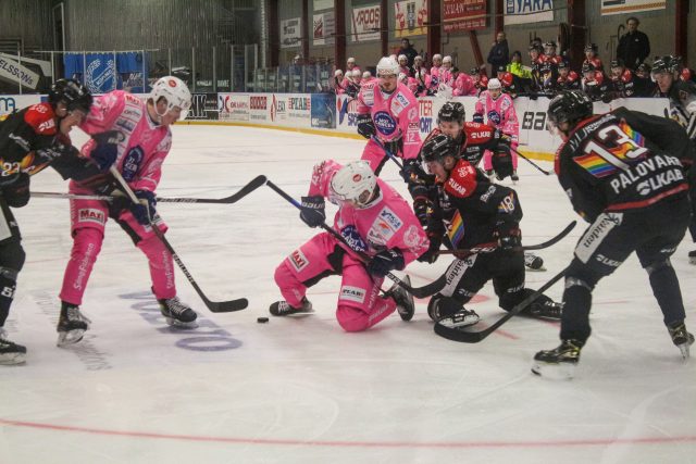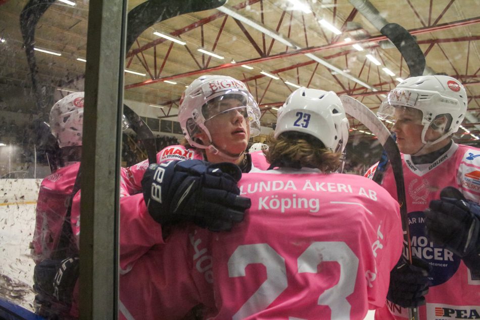 Köping Hockey, här i sitt rosa matchställ dagen till ära, vann den viktiga matchen mot gästande Kiruna. Foto: David Eriksson