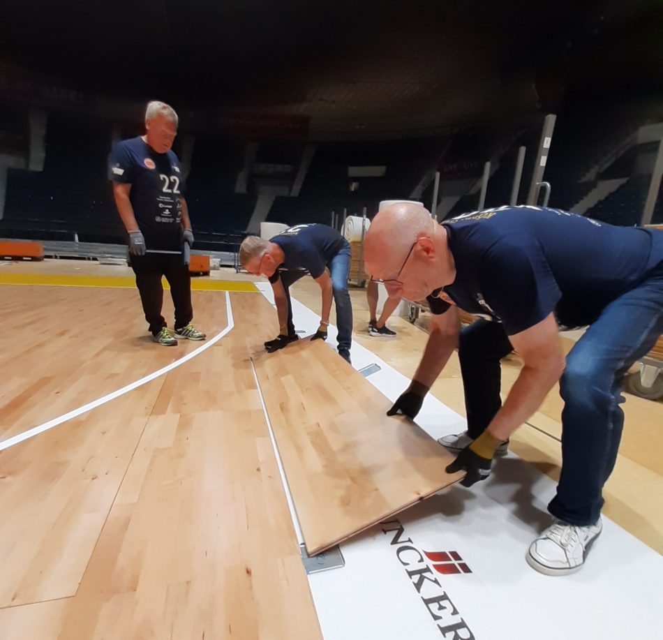 – Det tar cirka tre timmar för oss att lägga golvet, säger Håkan Lövling. Sen på torsdag efter matchen så ska vi även se till att ta bort golvet.