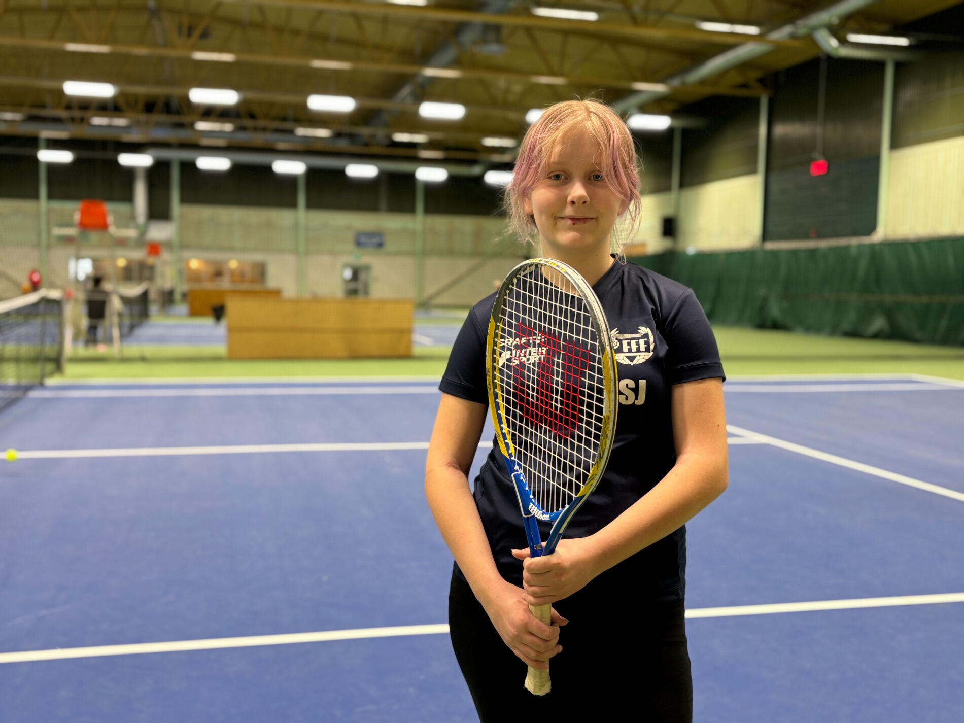 På banan bredvid var 13-åriga Signe Jansson, också hon från Köping, en av flera som nötte slag under överseende av Köpings Tennisklubb & Padels tränare, Ulf Vestlund.
