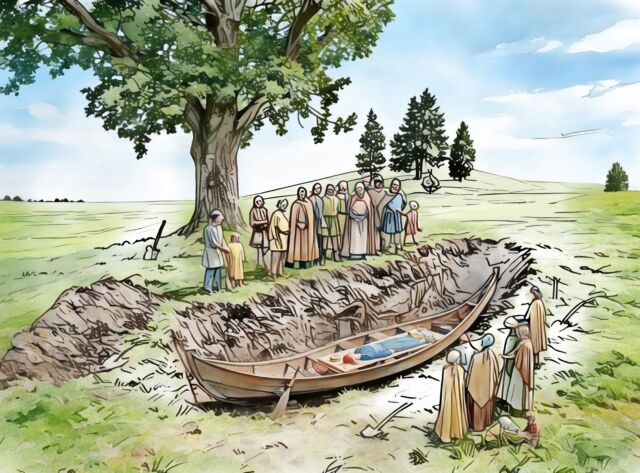 Illustration över hur en begravningsceremoni i Norsa kunde ha sett ut för 1 300 år sedan.